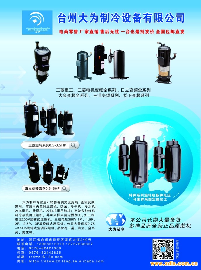臺州市大為制冷設(shè)備有限公司是是一家專業(yè)生產(chǎn)銷售家用空調(diào)壓縮機的廠家,是經(jīng)國家相關(guān)部門批準(zhǔn)注冊的企業(yè)。公司位于長三角最遠(yuǎn)城市:“浙江臺州市路橋區(qū)南官大道240號”主營各類空調(diào).熱泵壓縮機主要產(chǎn)品有:0.75-5Hp旋轉(zhuǎn)式空調(diào)壓縮機,8-25Hp全封閉活塞式壓縮機等。公司大量供應(yīng)0.75-3.5Hp旋轉(zhuǎn)式空調(diào)壓縮機,主要優(yōu)勢以其穩(wěn)定的產(chǎn)品質(zhì)量,較低的價格,已成為出口空調(diào)企業(yè)的理想配套產(chǎn)品出口多個國家,市場經(jīng)銷商反映良好。 公司本著“客戶第一,誠信至上”的原則,與多家企業(yè)建立了長期的合作關(guān)系。熱誠歡迎各界朋友前來參觀、考察、洽談業(yè)務(wù)。 公司服務(wù)宗旨:為客戶提供具有競爭力的優(yōu)質(zhì)配套產(chǎn)品,為客戶提供及時的售前、售中、售后服務(wù)。