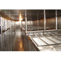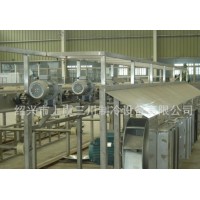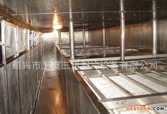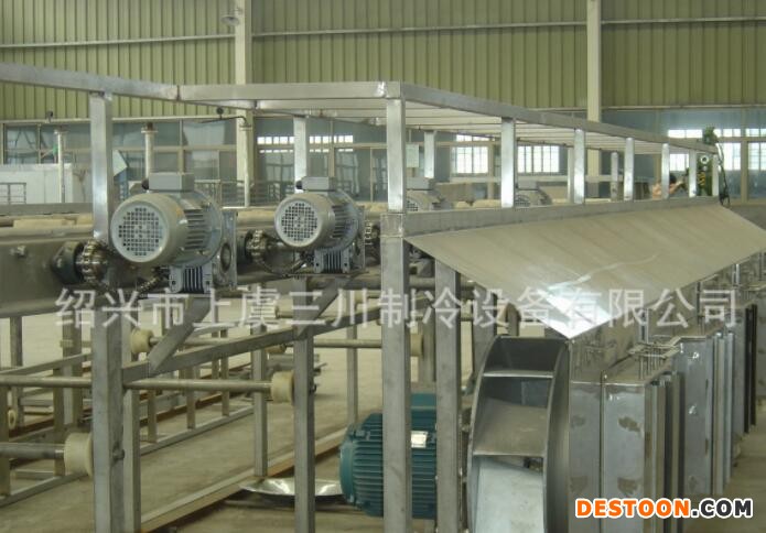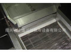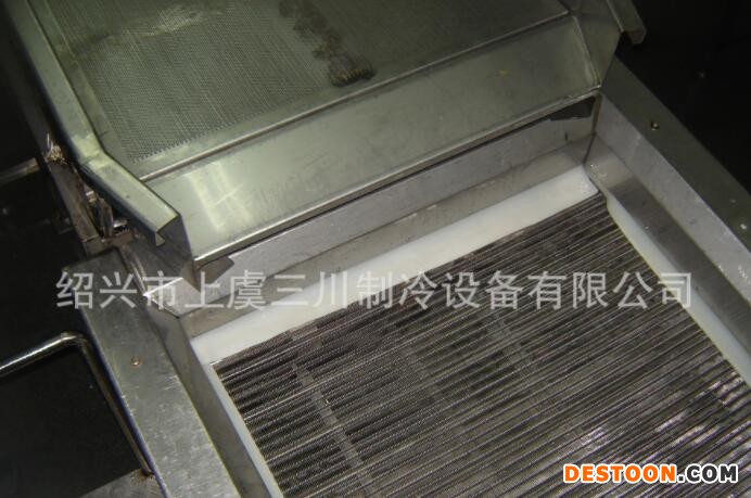 這是一種性能卓越,設(shè)計(jì)先進(jìn)、新穎的流態(tài)化速凍裝置,是我公司在多年生產(chǎn)流態(tài)化速凍裝置的基礎(chǔ)上,結(jié)合國內(nèi)外同類生產(chǎn)廠家的優(yōu)點(diǎn)研制生產(chǎn)的,產(chǎn)品在凍結(jié)過程中真正做到了全浮狀態(tài),在使用中獲得客戶的普遍好評(píng)。 2、工作特點(diǎn):1)、凍結(jié)效率高,凍結(jié)產(chǎn)品種類多;2)、實(shí)現(xiàn)食品的連續(xù)單體速凍;3)、采用機(jī)械風(fēng)冷裝置,能耗低;4)、采用高壓風(fēng)機(jī)、網(wǎng)帶采用變頻調(diào)節(jié)和時(shí)間指示器,實(shí)現(xiàn)精確加工;5)、采用連續(xù)清洗、干燥裝置,清潔衛(wèi)生;6)、在-32蒸發(fā)溫度下即可實(shí)現(xiàn)快速凍結(jié);7)、凍結(jié)產(chǎn)品種類繁多,除適用于果蔬類食品連續(xù)凍結(jié)外,不增添設(shè)施和改變裝置的情況下,還可適用于海產(chǎn)品,如扇貝丁、蝦仁、魚片等連續(xù)快速凍結(jié);8)、沖霜間隔時(shí)間長,保證生產(chǎn)的連續(xù)性。 3、技術(shù)說明:1)、產(chǎn)品在制冷系統(tǒng)蒸發(fā)溫度為-32即可實(shí)現(xiàn)快速凍結(jié),此時(shí)出料溫度 為-18,節(jié)省能源,充分利用冷量; 2)、網(wǎng)帶可以調(diào)速,以適應(yīng)于多種食品的凍結(jié);3)、最佳的速度組合,保證各類食品的速凍要求;4)、離心風(fēng)機(jī):該系統(tǒng)采用高壓離心風(fēng)機(jī),很大的靜壓范圍內(nèi)產(chǎn)生相應(yīng)的風(fēng)力,保證形成流化床,同時(shí)延長沖霜間隔時(shí)間;5)、庫體采用δ120mm的雙面不銹鋼夾聚胺脂發(fā)泡夾芯板,門鎖為德國進(jìn)口,保溫效果顯著,外形美觀大方,為國內(nèi)速凍機(jī)最佳庫板;6)、輸送網(wǎng)帶采用不銹鋼網(wǎng)帶傳送,所有與食品接觸部分均為不銹鋼;7)、電控箱:單獨(dú)的控制盤能進(jìn)行獨(dú)立的電啟動(dòng)和控制網(wǎng)帶傳送速度的操作。 4、特征優(yōu)點(diǎn):1)、網(wǎng)帶為變頻調(diào)速:在最佳條件下凍結(jié)各種食品,食品無損傷,食品不粘結(jié)。2)、冷風(fēng)機(jī):采用鋁管鋁整套片,進(jìn)風(fēng)側(cè)片距大,長時(shí)間工作不結(jié)霜; 3)、高壓風(fēng)機(jī):保證連續(xù)生產(chǎn),延長沖霜間隔時(shí)間;4)、標(biāo)準(zhǔn)保溫絕熱板:組裝快,結(jié)合緊密,不逃冷;5)、蒸發(fā)溫度采用-32,與蒸發(fā)溫度為-40相比,系統(tǒng)節(jié)能25%左右;6)、綜合電控箱:可以控制網(wǎng)帶走速,控制生產(chǎn)時(shí)間,顯示轉(zhuǎn)速與庫內(nèi)溫度;7)、根據(jù)客戶需要,可設(shè)計(jì)安裝小車道凍結(jié),以增加產(chǎn)量及品種。