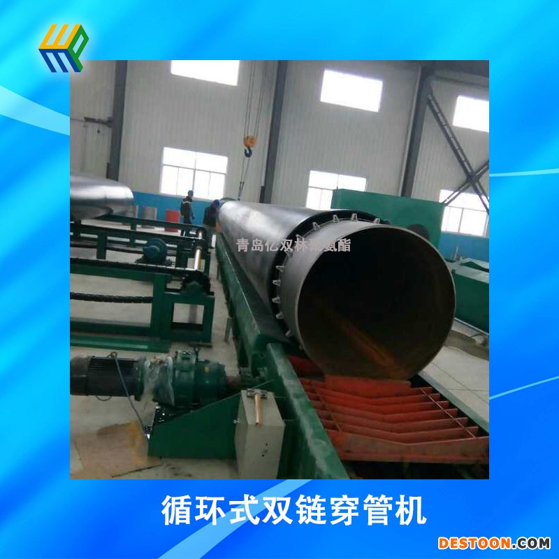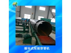 循環(huán)式雙鏈穿管機(jī)是在原有的基礎(chǔ)上,億雙林采納客戶的建議而設(shè)計(jì)的新型穿管機(jī),改變原來設(shè)備穿完一根管道后,必須等到傳動鏈條帶動的小車退到原起點(diǎn)位置才能進(jìn)行下一根管道的穿管工作;本臺新型穿管機(jī)不需要做長距離后退,設(shè)備的傳動鏈條上每隔0.6米有一個V型支撐板,均勻的裝在鏈條上,用來支撐綁完發(fā)泡支架的鋼管,并在鏈條上設(shè)有兩個推管裝置,當(dāng)把鋼管放在鏈條的V型支撐板上,其中一個推管器推動鋼管前進(jìn),當(dāng)鋼管運(yùn)行到前端時,另一個推管裝置就隨著鏈條運(yùn)行到起點(diǎn)位置,這時再吊裝一根鋼管放到V型支撐板上,如此循環(huán)往復(fù),不用長距離倒退鏈條,很大程度上節(jié)省時間,提高了工作效率;減少了設(shè)備的故障。