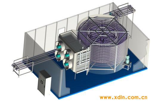 6,螺旋塔和蒸發(fā)器外圍的擋風板設計成對稱的,流暢的環(huán)形風道,增強凍品的換熱效果而又使得進出料口不跑冷。而且操作人員也可隨時進入庫內觀察設備運行情況。